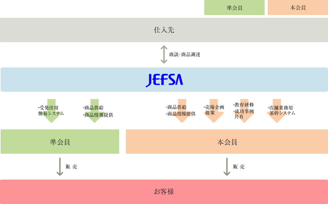 当社はボランタリーチェーンの本部として各加盟店の特長を活かした店舗経営を目指しています。経営は自店の責任ですが、ジェフサチェーンは加盟店の経営向上を図り、発展に貢献することを主題として、本部と店舗が一緒になって店づくりに取り組む組織となります。